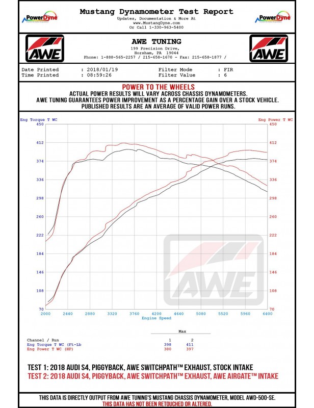 The included AWE Tuning S-FLO Filter is designed specifically for this air box to be easily serviceable and to maximize airflow. This increase in airflow unlocked maximum gains of 19 hp and 22 ft-lbs of torque at the crank.